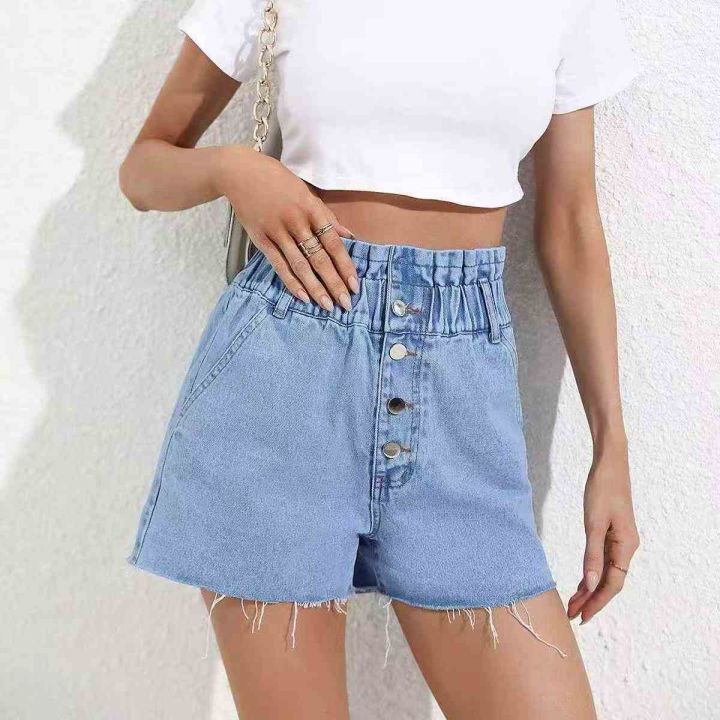 布景牛仔短裤女夏季潮流做旧毛边松紧高腰宽松休闲热裤...