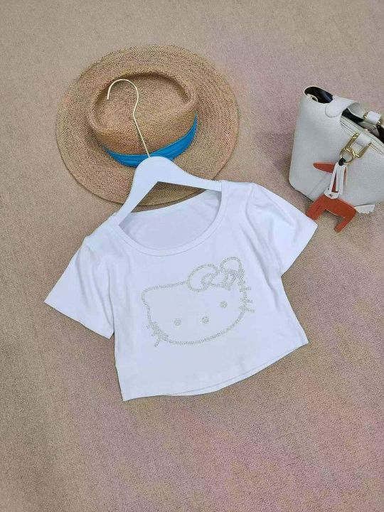 [月亮]:猫咪烫钻洋气短款气质辣妹棉T恤