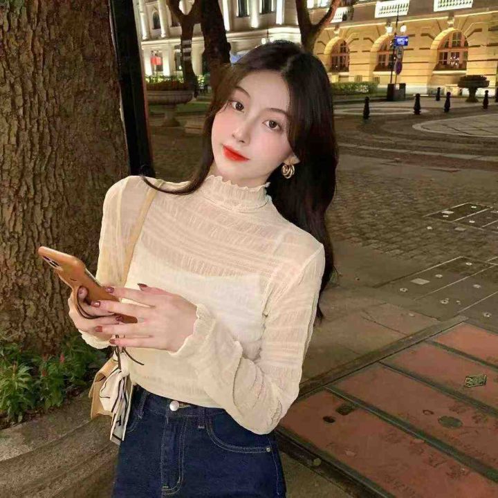 靓妹气质半高领网纱打底衫350件5.9,面料柔软高弹力,...