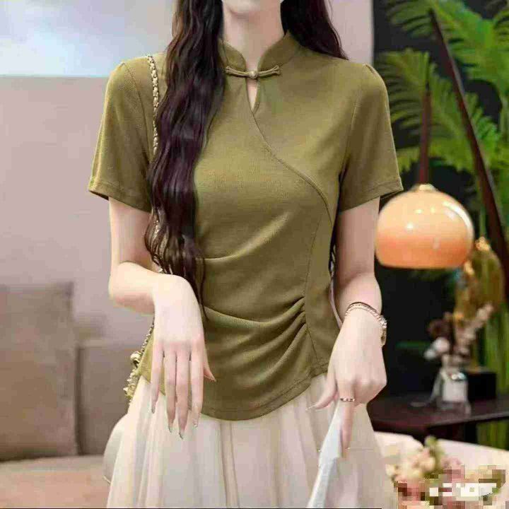 3️⃣南油货新中式国风靓妹立领盘扣褶皱短袖t恤632件,均码,绿色为主米白...