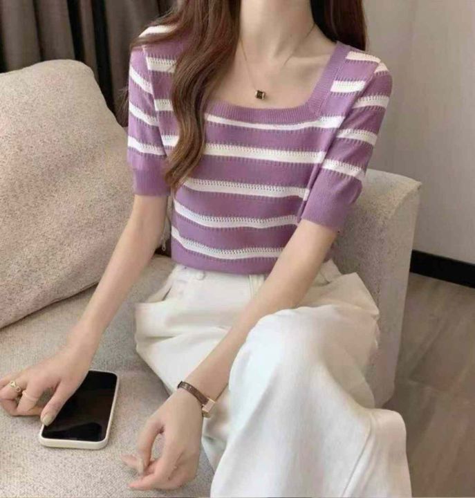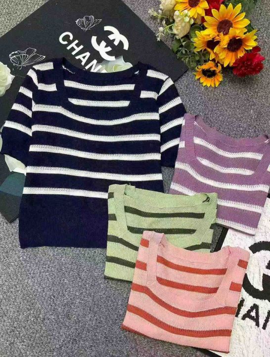 夏季新款撞色条纹韩系针织短袖T桖,独立包装,均码面料柔软舒适弹力大,单款多色,258件,全清5.9元超低价秒杀!分货加一!