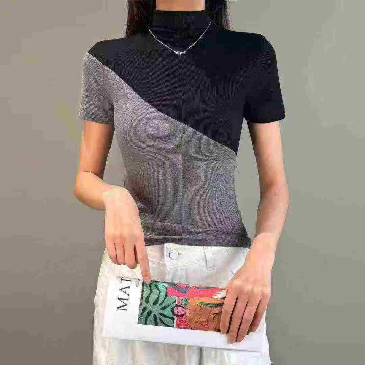 天猫在售款350件左右高品质夏季半高领拼色螺纹短袖T恤,单款单色,高弹力,码数S-XL,独立包装带吊牌