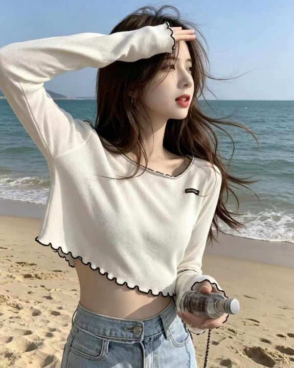 春夏季新款纯欲辣妹一字领小标设计感薄款针织长袖衫,...