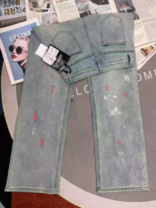 浅蓝色阔腿春季油彩漆点宽松设计感泼墨拖地牛仔裤,单款单色,独立包装,数量350条,S-XL码,福利价18.8秒杀(8006#610)