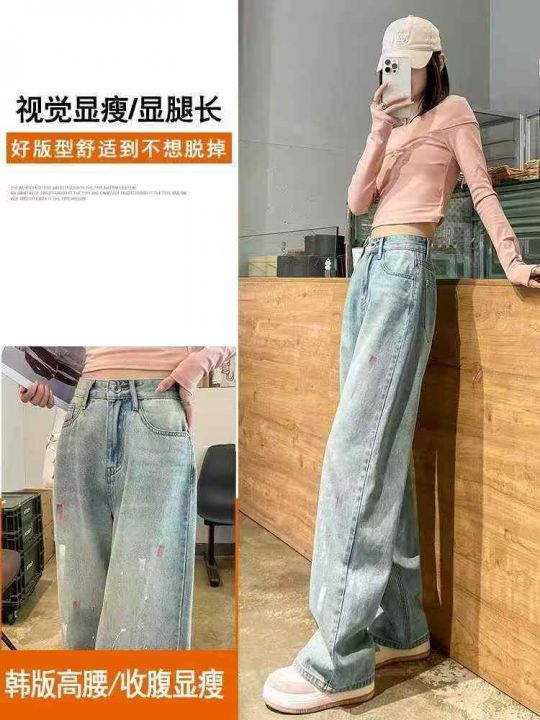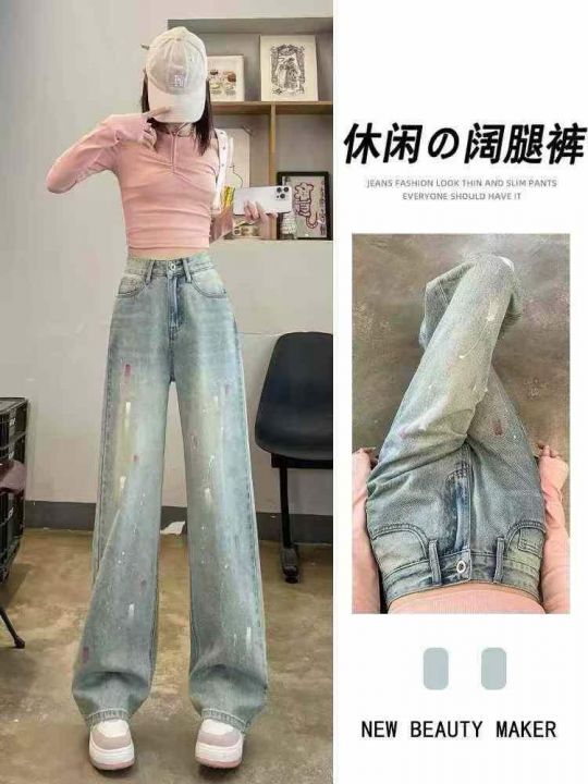 浅蓝色阔腿春季油彩漆点宽松设计感泼墨拖地牛仔裤,单...