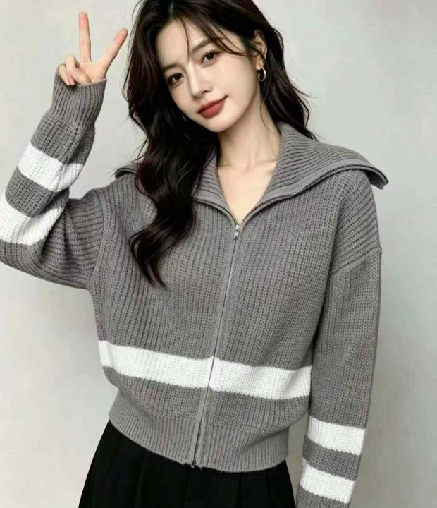秋冬新款洋气韩版设计感拉链翻领毛衣开衫,独立包装,...