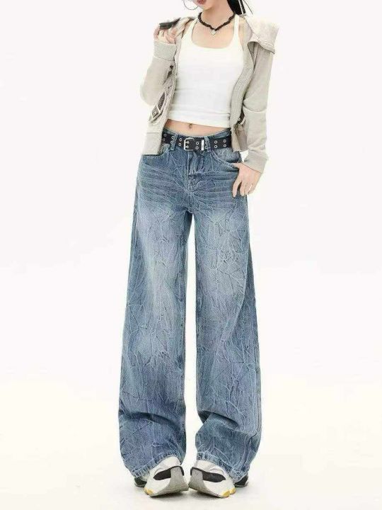 大码胖mm复古低腰裂纹阔腿牛仔裤女绣标设计感独特宽松显瘦直筒裤347条全14....