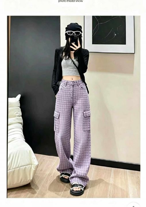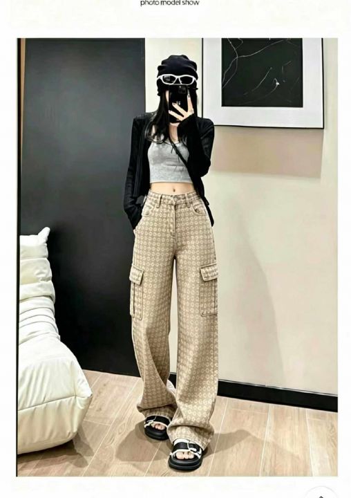 高街迷宫格阔腿牛仔裤女新款显瘦ins潮直筒工装拖地裤369条全清12.8元,码数...