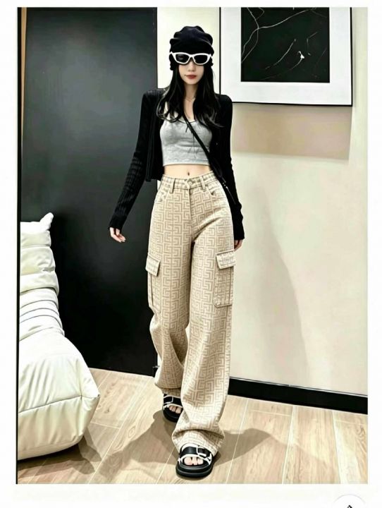 夏季新款设计感提花高腰显瘦气质百搭多袋直筒阔腿工装...