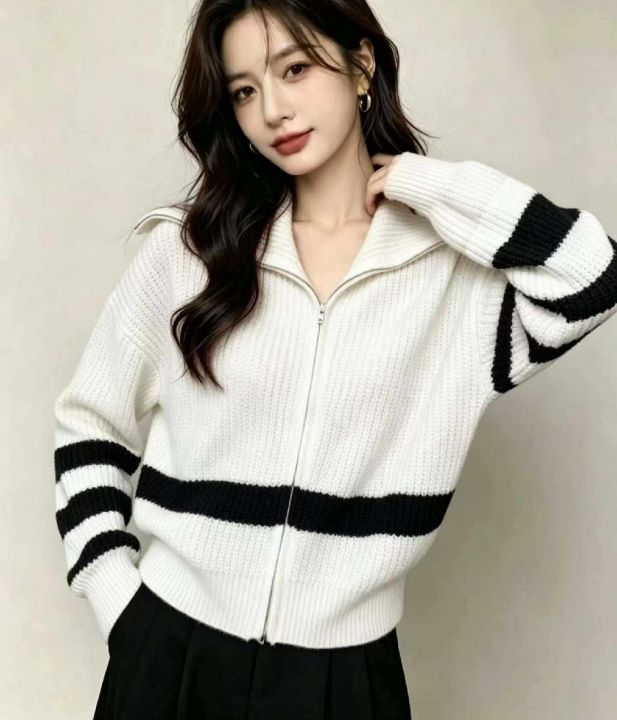 秋冬新款洋气韩版设计感拉链翻领毛衣开衫,独立包装,...