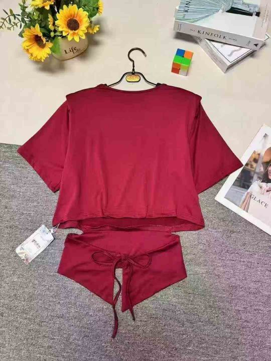 ❄️气质名媛风高级感酒红色法式绑带显瘦短袖上衣,单款单色,有肩垫设计,品质好有独立包装,码数S- XL,数量300件,全清6.8元秒。
