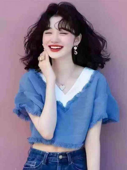 ❄️蓝白撞色v领流苏漂亮独特网红款短袖上衣,单款单...