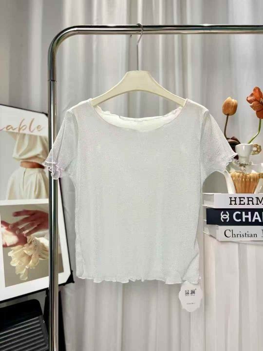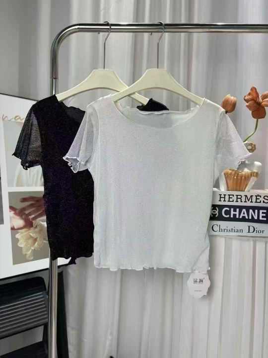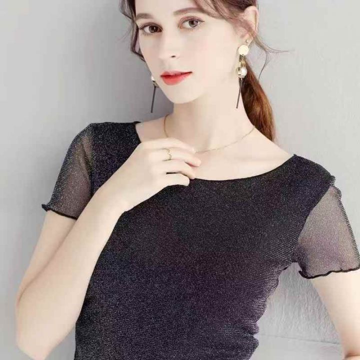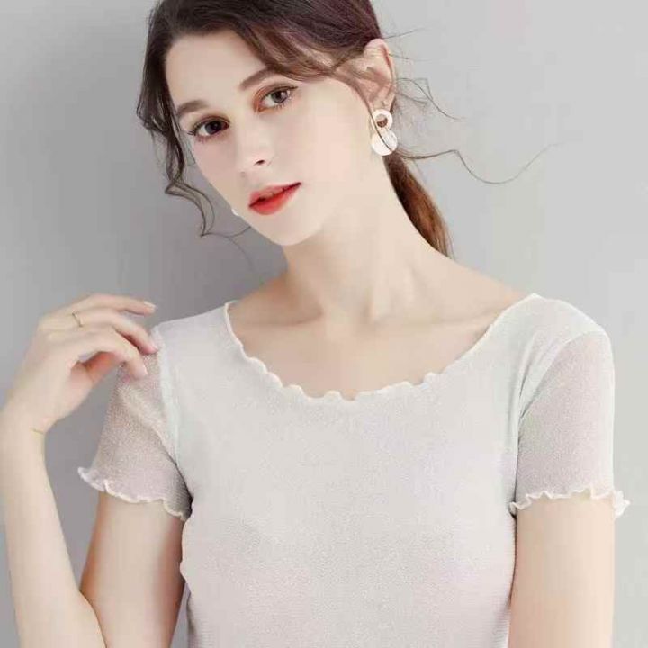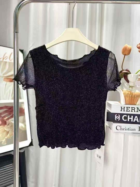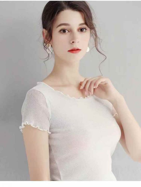 285件短款木耳边网纱打底衫女短袖内搭纱衣圆领新款亮...