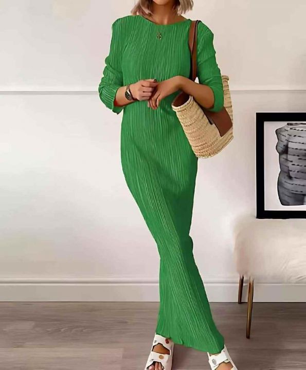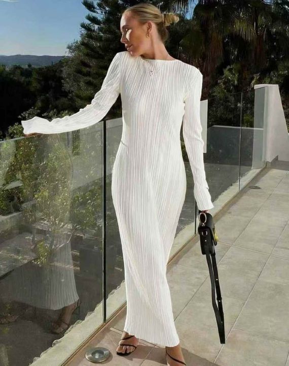 春季新款品牌外贸原单美式三宅弹力褶皱大长款连衣裙,...