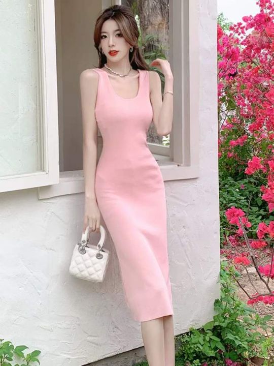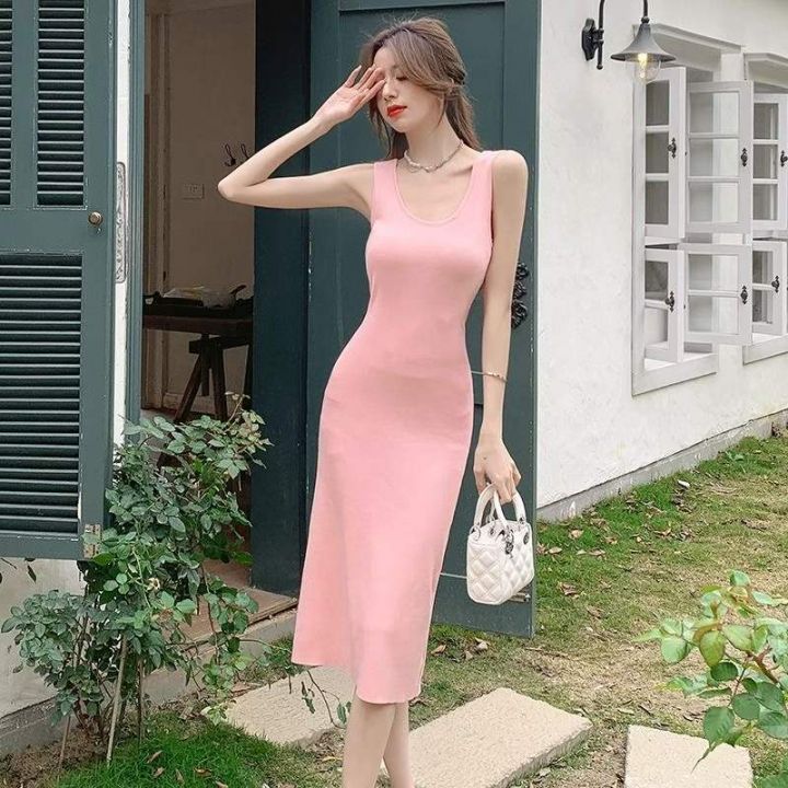 夏季新款净版简约弹力修身显瘦针织背心连衣裙,100件...
