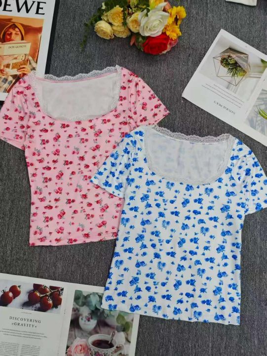 2.9清电商仓回收700件辣妹复古碎花蕾丝纯欲短袖T恤,...