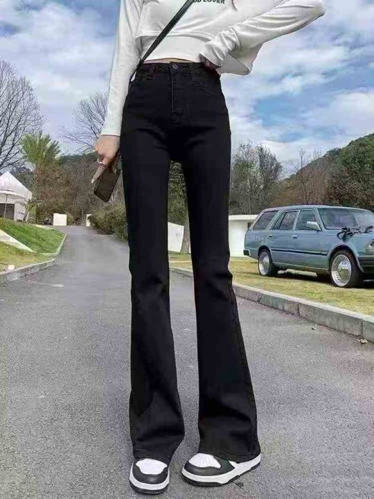 黑色弹力微喇牛仔裤春季新款高腰显瘦喇叭裤修身拖地马...