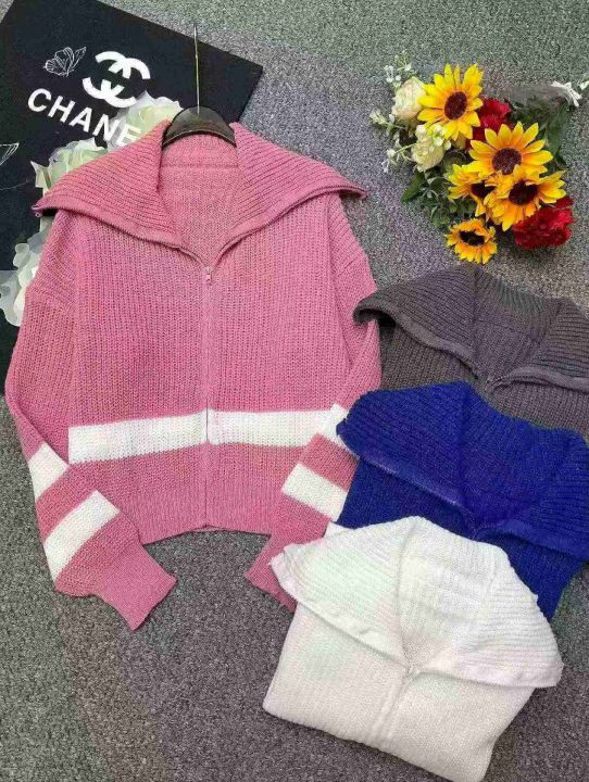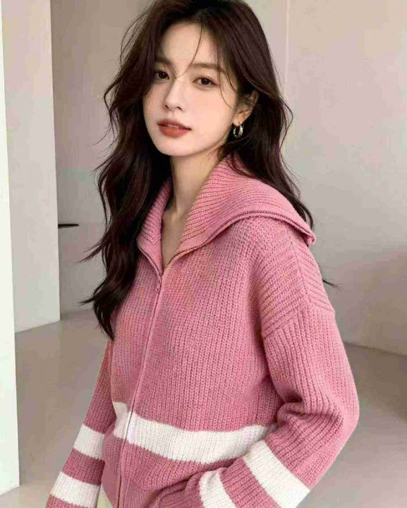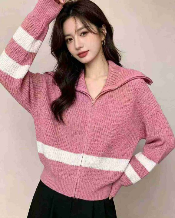 秋冬新款洋气韩版设计感拉链翻领毛衣开衫,独立包装,...