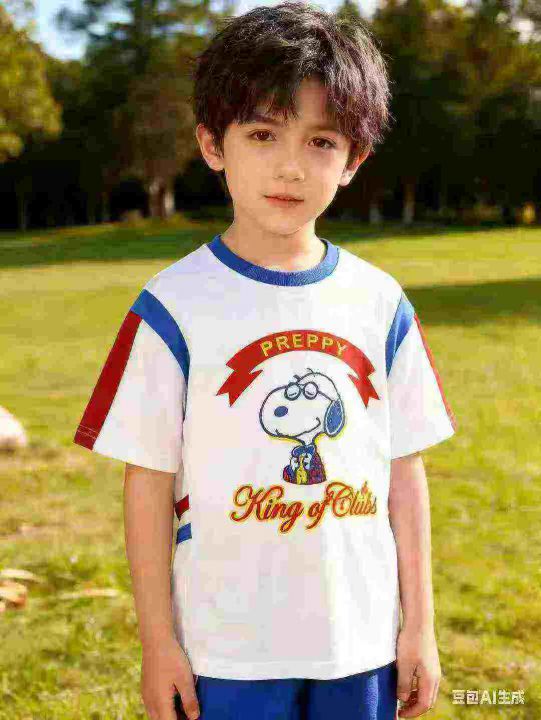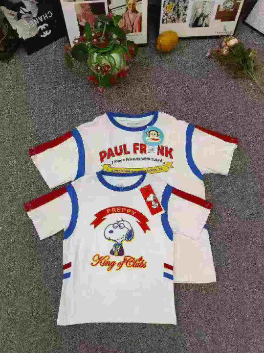 品牌童装个性logo短袖T恤,数量1000件左右,码数110--160,整款两个品牌(史努比、大嘴猴) 可分品牌出,后领包边,货品整洁质佳