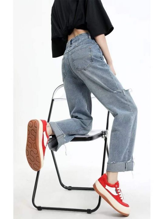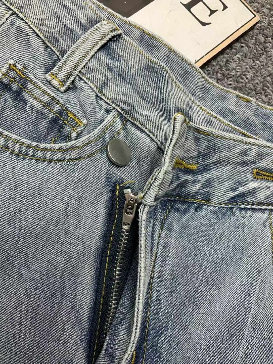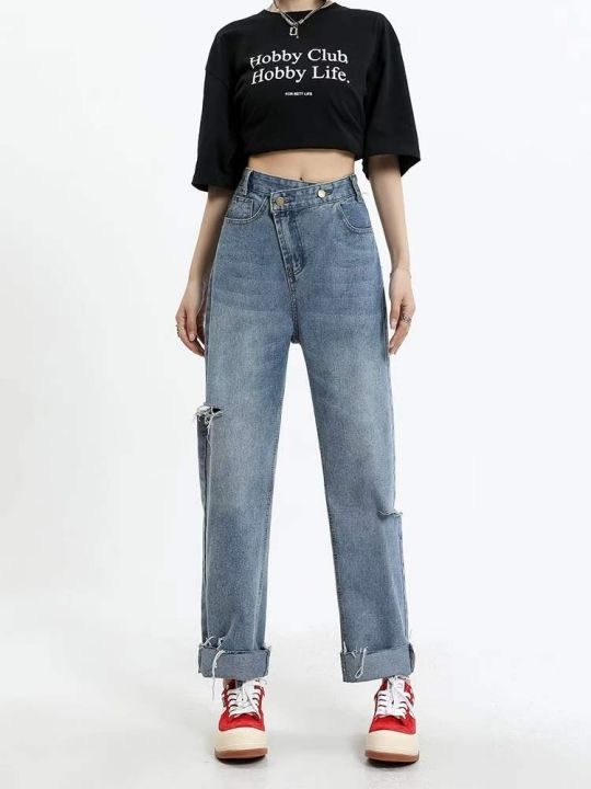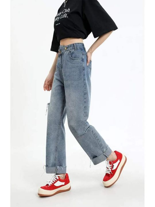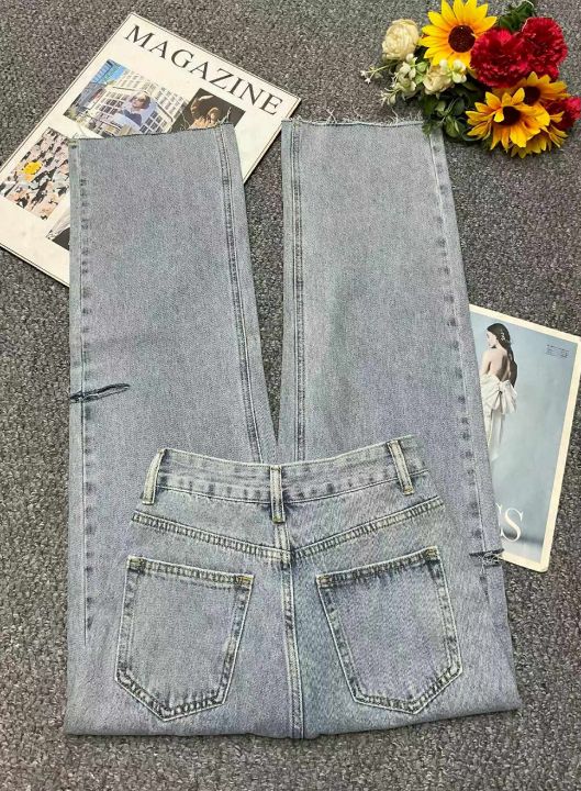 春夏季新款网红复古破洞设计款牛仔毛边直筒裤,独立包...