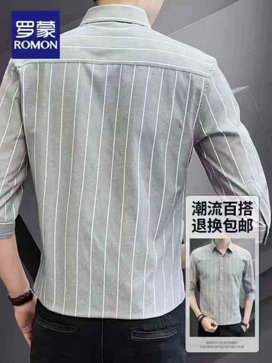 高端男士休闲中袖衬衫夏季冰丝雪纺韩版潮流修身大条纹...