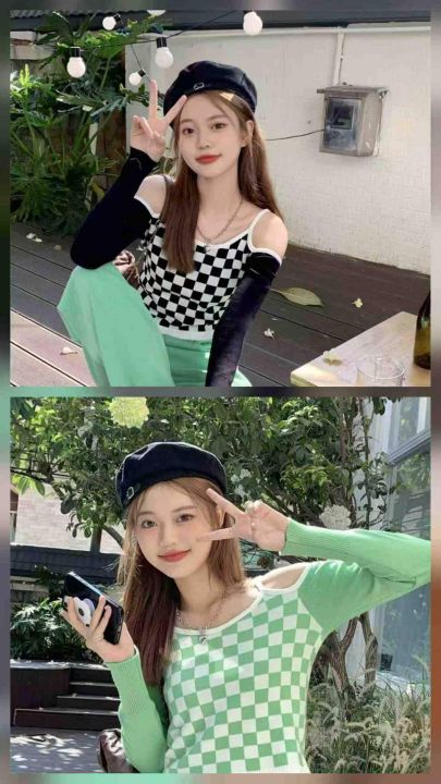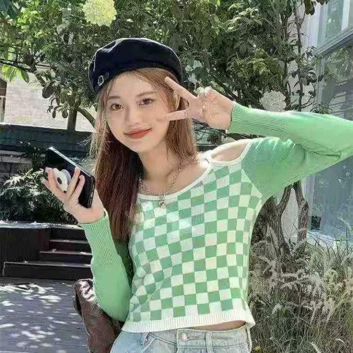 800件 春秋时尚格子露肩提花性感长袖上衣打底衫女,...
