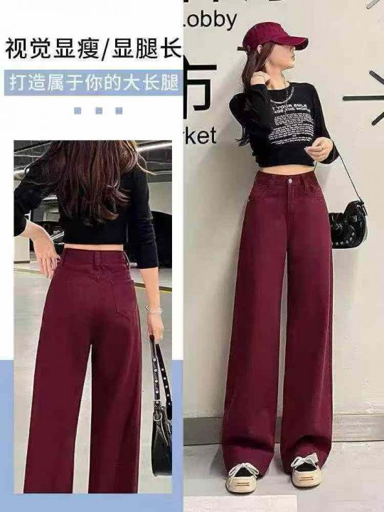 安哥拉红阔腿牛仔裤女春夏复古高腰暗红窄版宽松垂感直筒拖地长裤257条全清1...