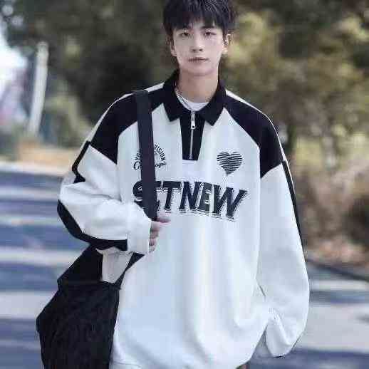 polo半拉链复古潮牌青少年宽松拼接翻领男士卫衣外套·...