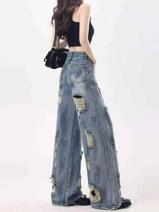 复古扎染废土风破洞女牛仔裤水洗垂感阔腿拖地裤,码数...