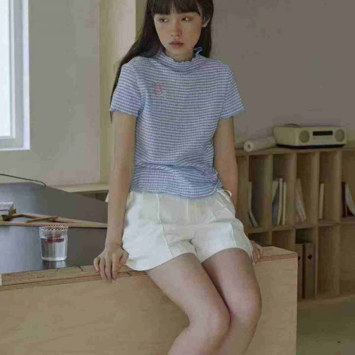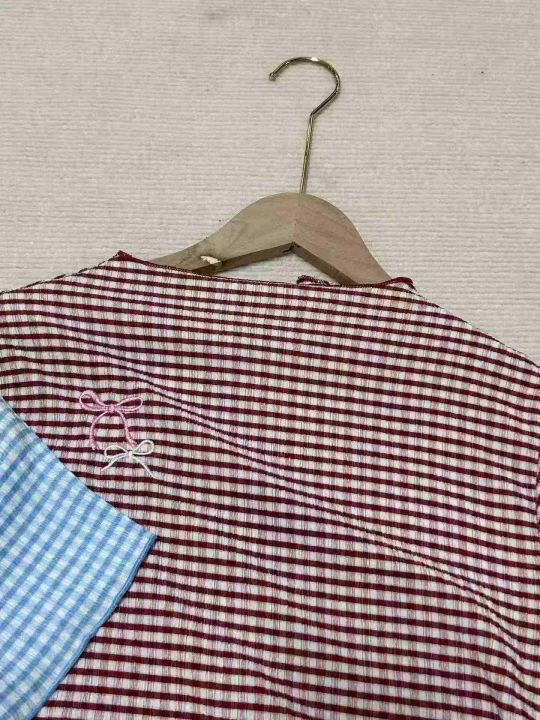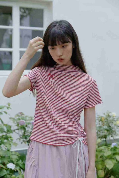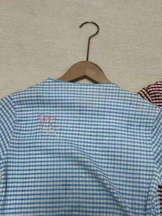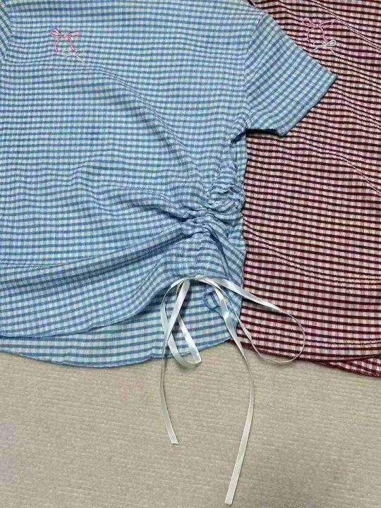 减龄韩系春夏条纹格子百搭时尚绑带靓妹蝴蝶结刺绣修身短袖上衣125件,全清7.8,不分货