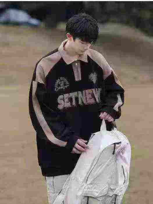polo半拉链复古潮牌青少年宽松拼接翻领男士卫衣外套·...
