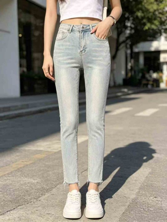 高腰浅蓝色牛仔裤女2026春夏新款弹力显瘦毛边直筒铅笔...