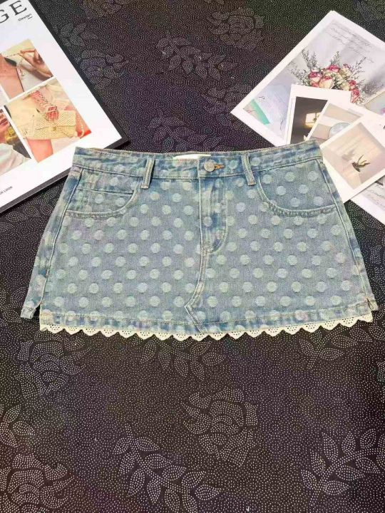 辣妹波点蕾丝花边带内衬牛仔短裙 101件,全清9.8元,正品独立包装,货品干净,码数:S/M/L。