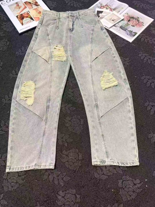 男女同款破洞弯刀阔腿牛仔裤 107件,全清14.8元,码数...