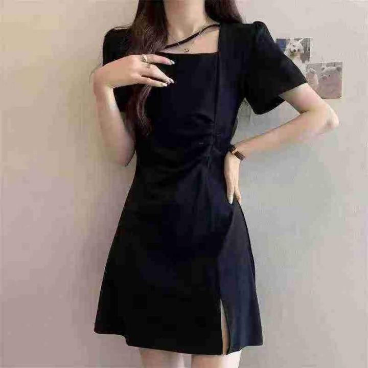 纯欲设计感方领斜条连衣裙375件8.5,面料舒适有弹力,褶皱收腰显瘦,下摆开...