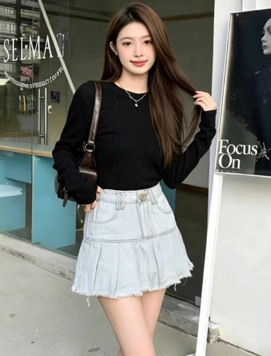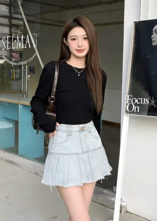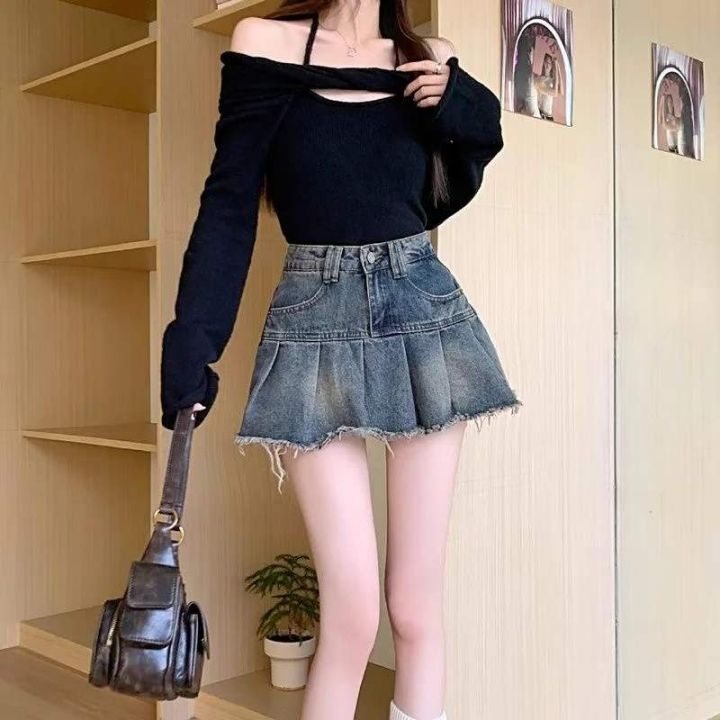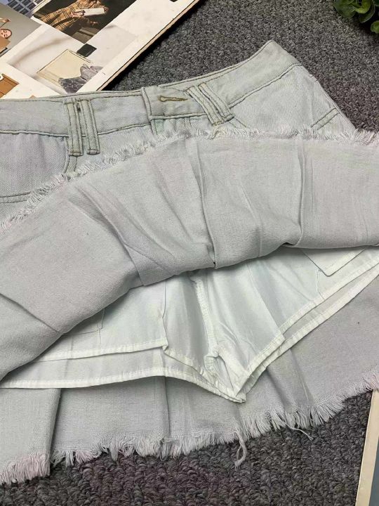夏季新款网红辣妹复古百褶洗水棉牛仔半身裙,独立包装...
