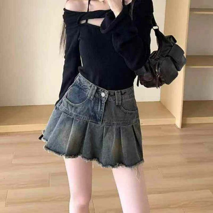 夏季新款网红辣妹复古百褶洗水棉牛仔半身裙,独立包装...