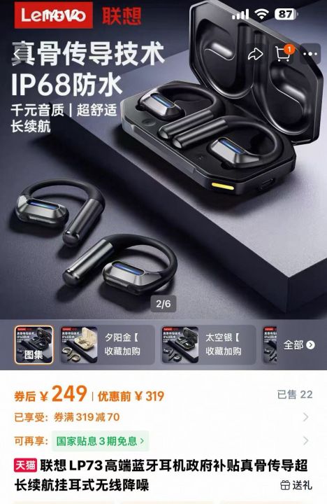 联想高端产品。联想ThinkPlus LP73开放式不入耳,液态硅胶耳挂,适合运动,稳固不夹耳。