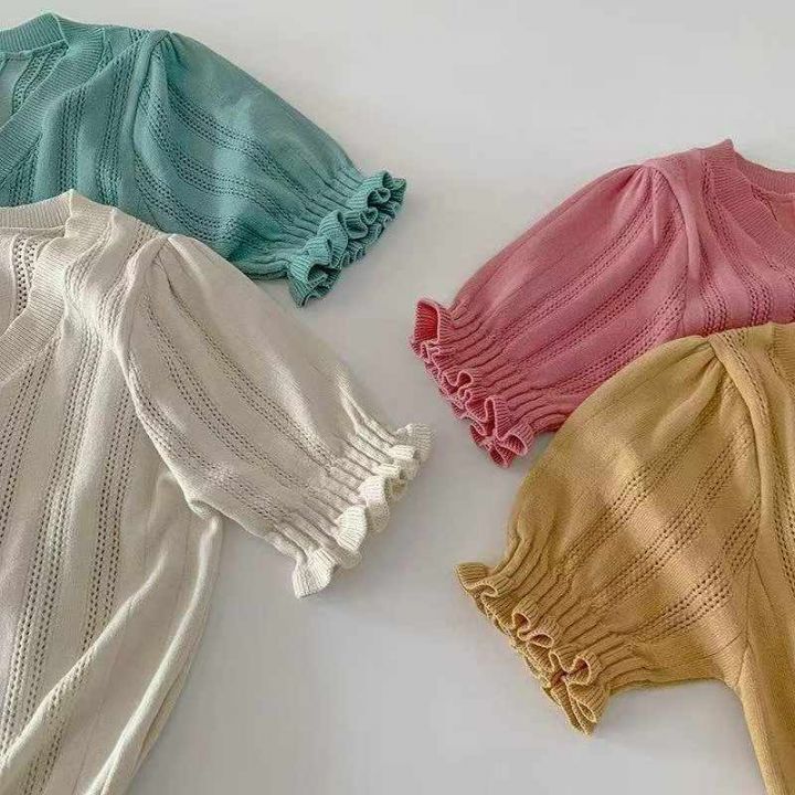 夏季新款镂韩版V领木耳边冰丝设计感高腰显瘦短款针织T...