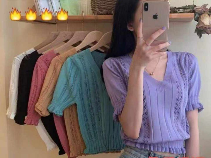 夏季新款镂韩版V领木耳边冰丝设计感高腰显瘦短款针织T桖,独立包装,均码面料柔软舒适弹力大,3560件,全清5.9元超低价秒杀!分货加一!