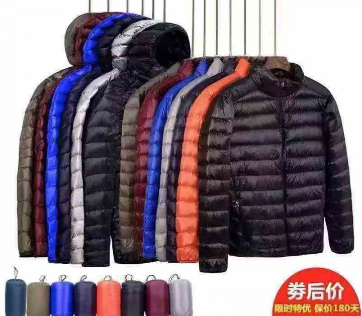 10000件男装优衣库轻薄款羽绒服,有大厂一手货源,帽有立,独立包装,M一4码,每件有收纳袋,全清28元,分货随机配30