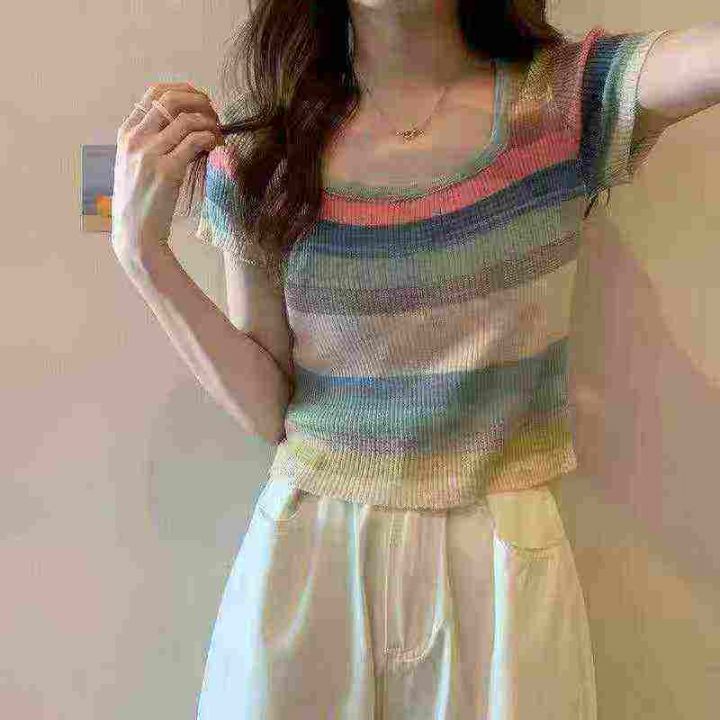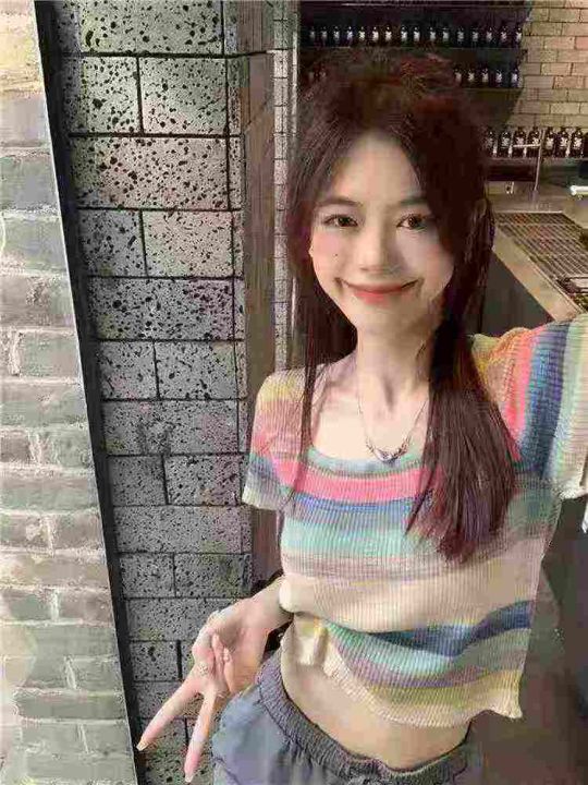 ☕️彩虹条纹方领短袖t恤女冰丝针织短款上衣超好看辣...