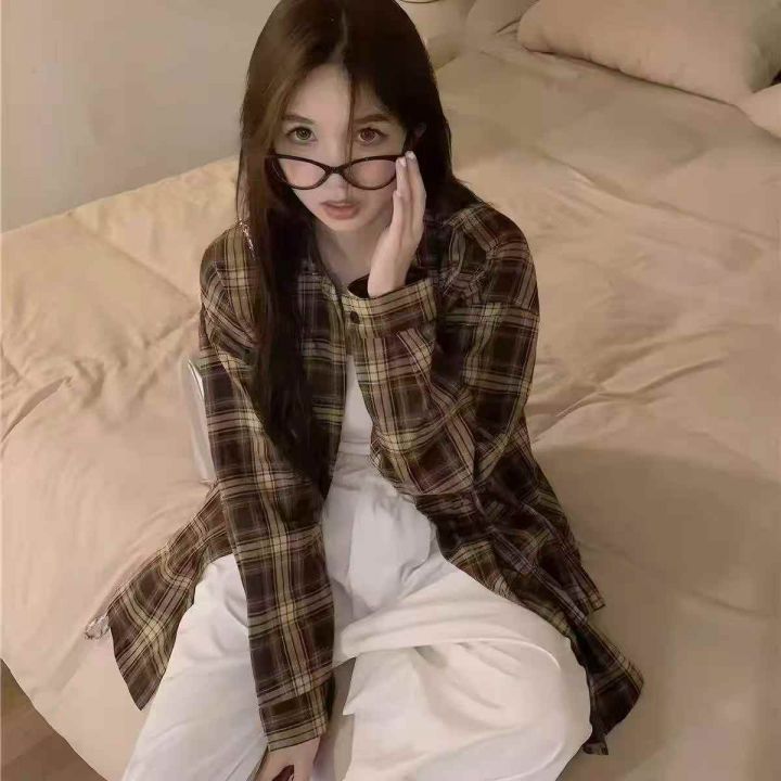 美式衬衫防晒复古春秋新款宽松格子长袖秋季外套衬衣上衣高级款码数:1-4码...