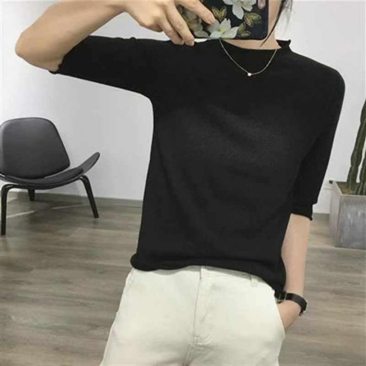 春夏季新款简约宽松百搭法式气质半高领包芯纱中袖针织...