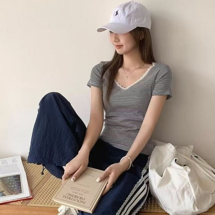 上新全清:6.8一件纯欲风甜辣小众条纹撞色蕾丝短袖,[爱心]60件左右,棕色...