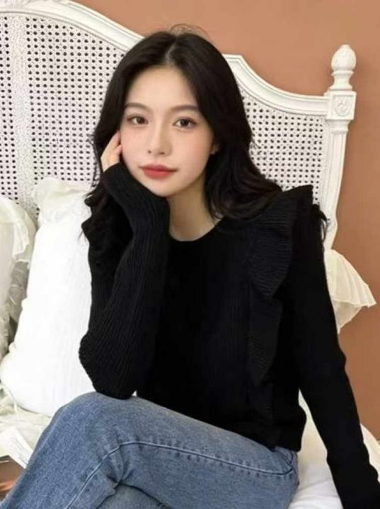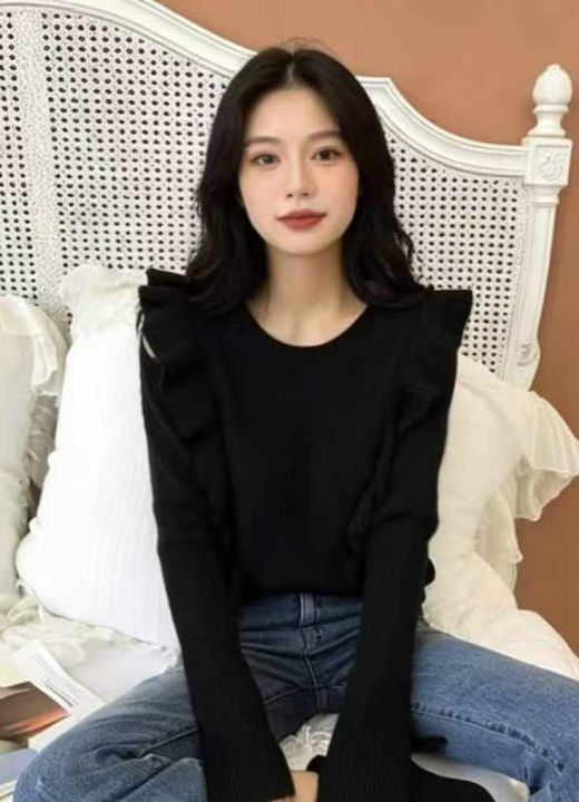 春季新款复古法式宽松百搭显瘦木耳边设计款圆领套头毛...
