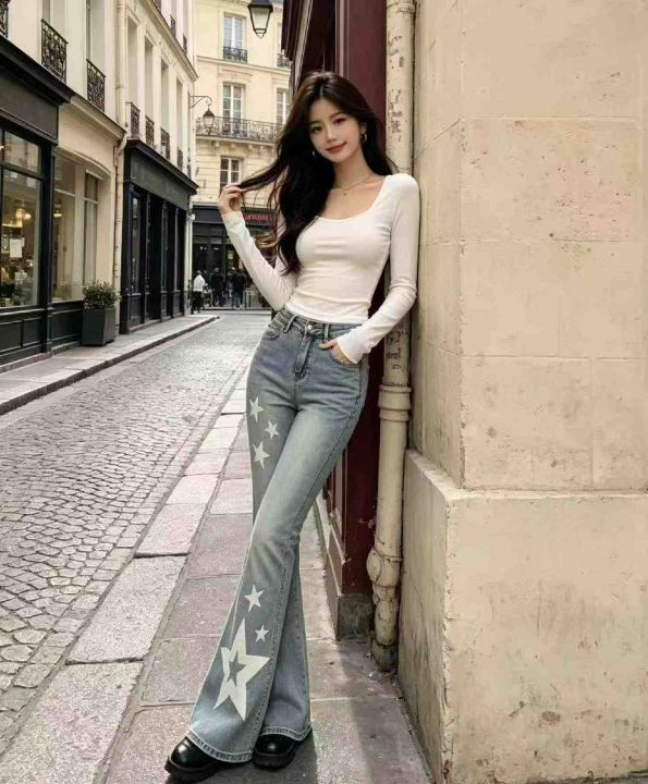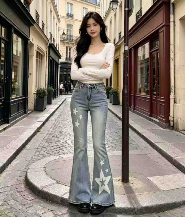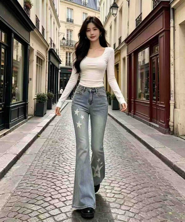 春季新款高弹力千禧辣妹微喇显瘦设计感小众牛仔长裤,...