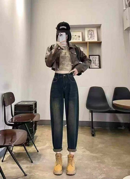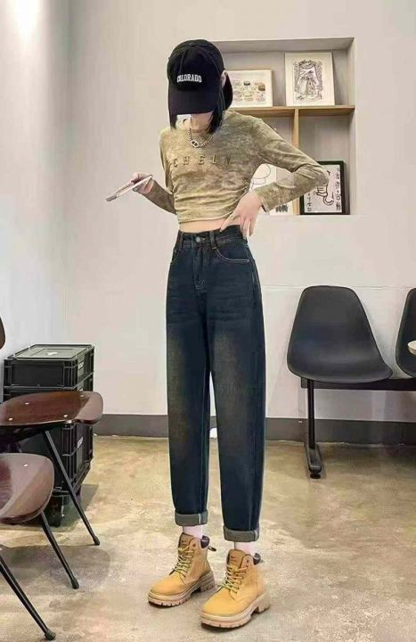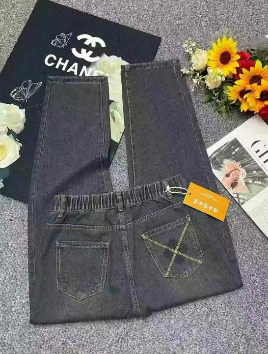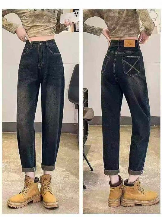 春夏季新款网红复古半松紧腰微胖MM哈伦牛仔老爹裤,独...