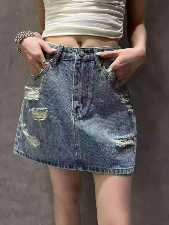 夏季韩版高腰a字牛仔短裙裤女显瘦毛边破洞包臀半身裙...