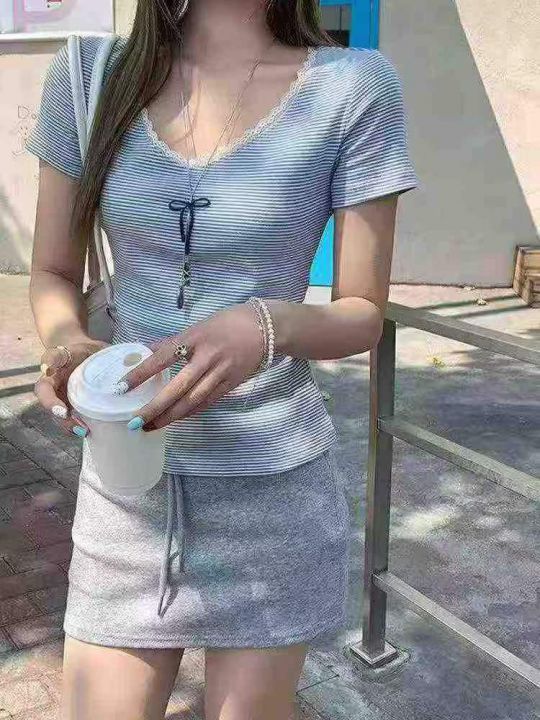 上新全清:6.8一件纯欲风甜辣小众条纹撞色蕾丝短袖,[...